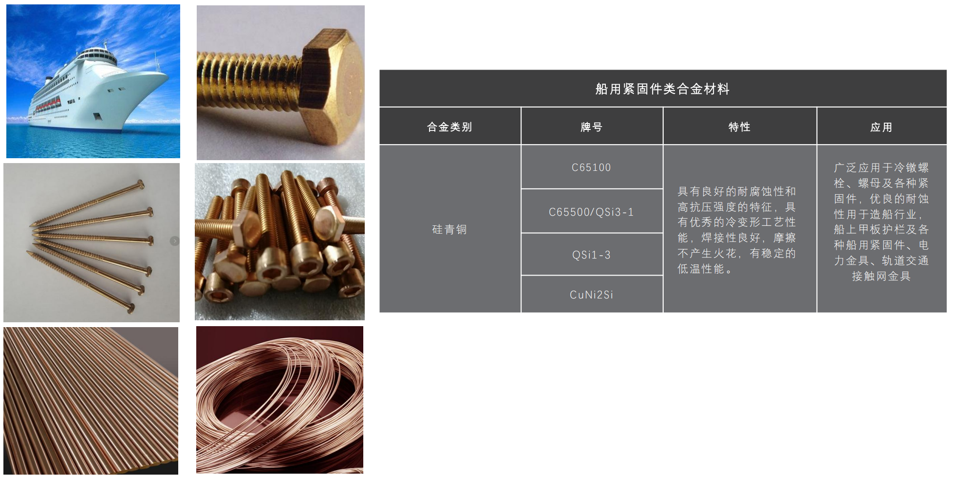 應(yīng)用:廣泛應(yīng)用于冷敏螺栓、螺母及各種緊固件,優(yōu)良的耐蝕性用于造船行業(yè)船上甲板護(hù)欄及各種船用緊固件、電力金具、軌道交通接觸網(wǎng)金具。